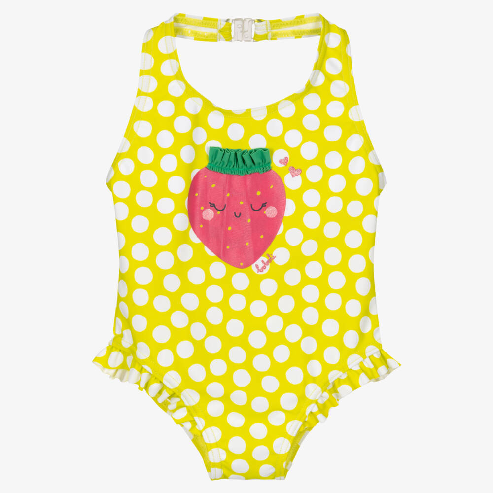 Silky soft and smooth green and white polka dot swimsuit for little girls by Spanish brand Boboli. Vibrant and girly, it has a strawberry with sparkly pink cheeks printed on the front, and a frilly green leaf appliqué. It has ruffled trims and an open back, with a useful clip fastening on the neck.