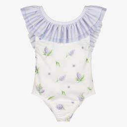 Silky soft and smooth green and white polka dot swimsuit for little girls by Spanish brand Boboli. Vibrant and girly, it has a strawberry with sparkly pink cheeks printed on the front, and a frilly green leaf appliqué. It has ruffled trims and an open back, with a useful clip fastening on the neck.