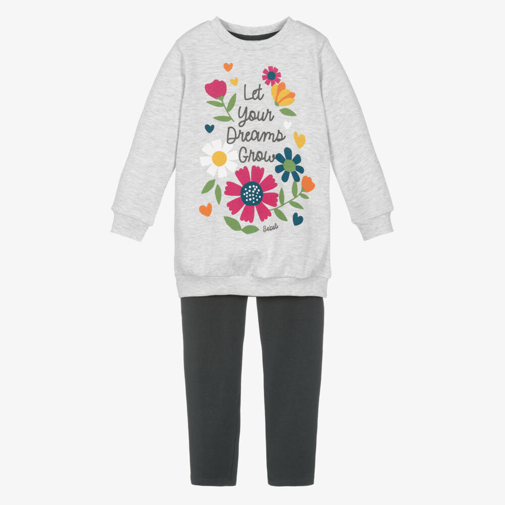 Lovely grey leggings set for little girls by Spanish brand Boboli, made in soft cotton jersey. The longer-length grey marl sweatshirt top has a cosy fleecy inside and a 'Let your dreams grow' motif on the front, surrounded by colourful flowers. It has a casual crew neckline and stretchy ribbed cuffs and hem. Smaller sizes have popper fastenings on one shoulder. It comes with a pair of dark grey full-length leggings, with a comfortable elasticated waistband.