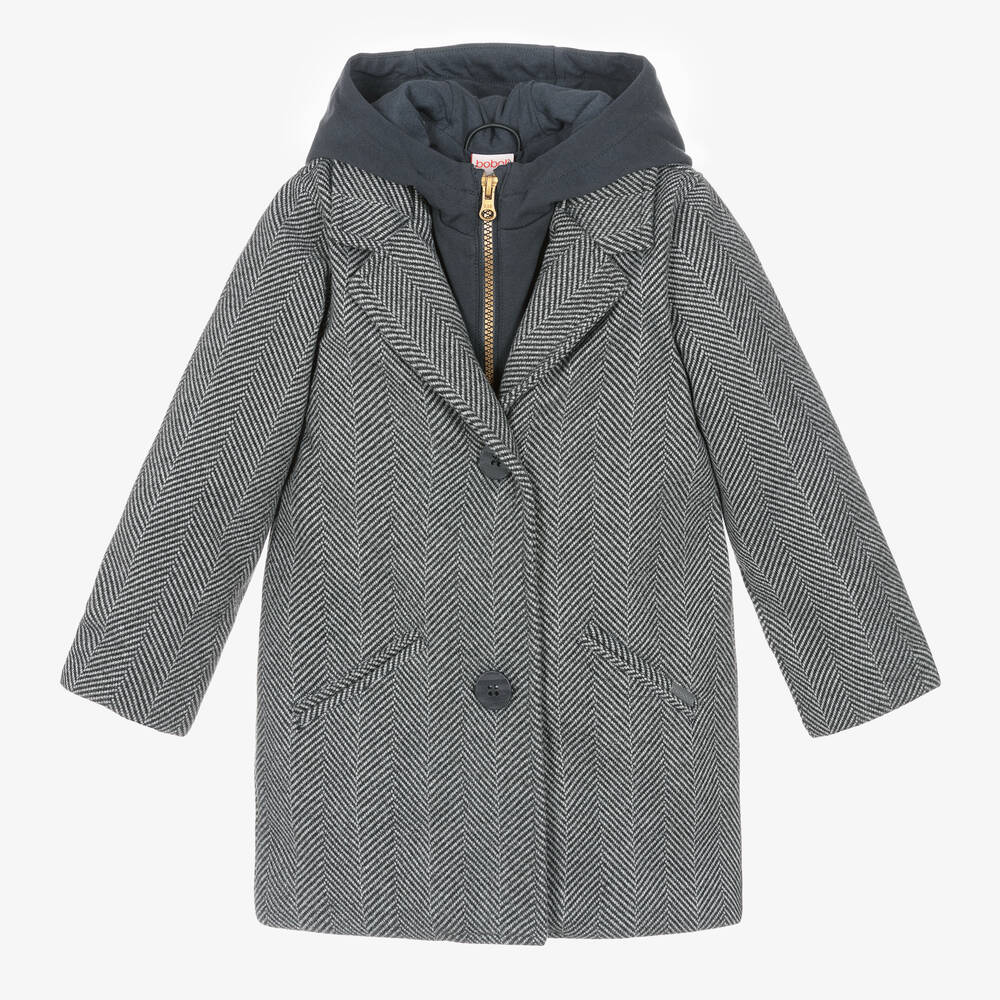 Girls dark grey herringbone coat by Spanish brand Boboli, made from a mid-weight, softly brushed cotton blend fabric. This smart design has a lapel collar, slanted front pockets and button fastenings. For extra protection against the elements, there is an attached, zip-fastening jersey insert and fixed hood. The coat is gently padded for warmth, with a silky smooth lining and vent on the back.