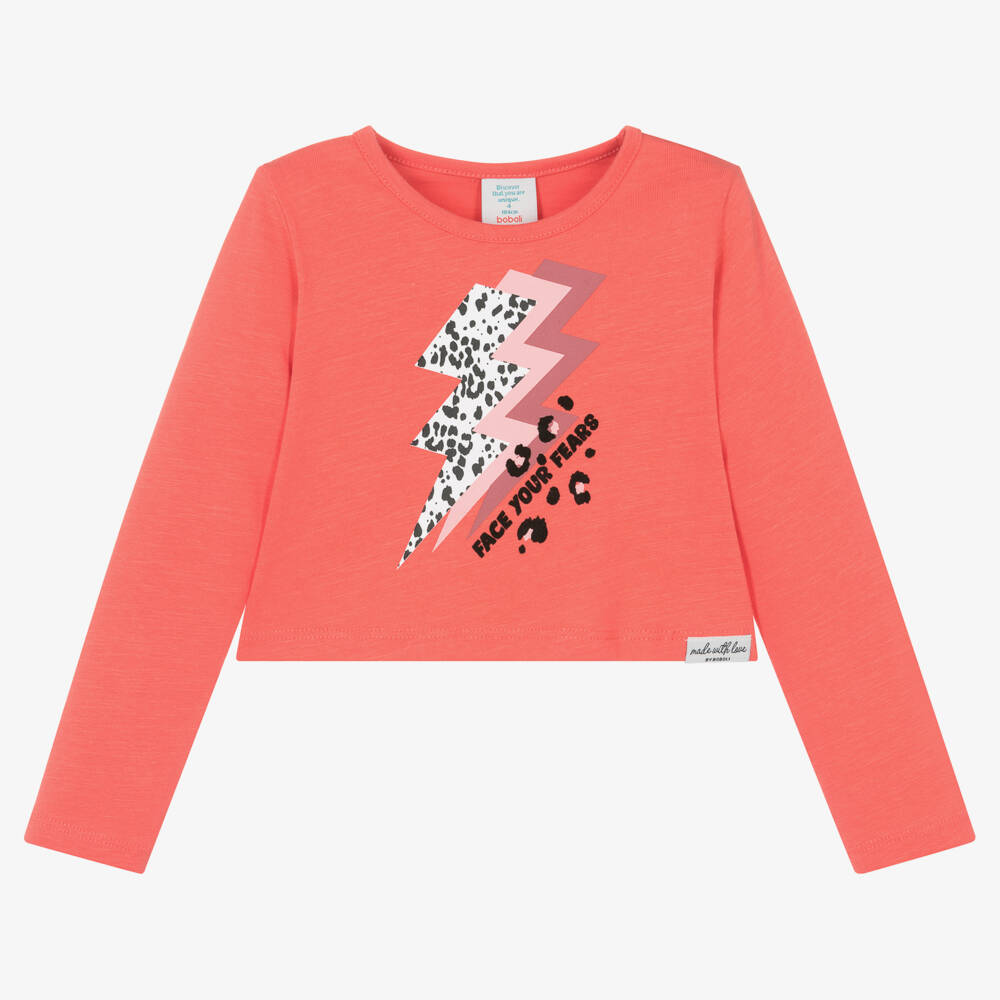 Orange long-sleeved top for girls by Boboli, made in soft and comfortable cotton jersey. In a stylish boxy fit, it has a cool lightning bolt print on the front with a black 'Face Your Fears' motif below. A logo tab on the hem adds a subtle designer touch.