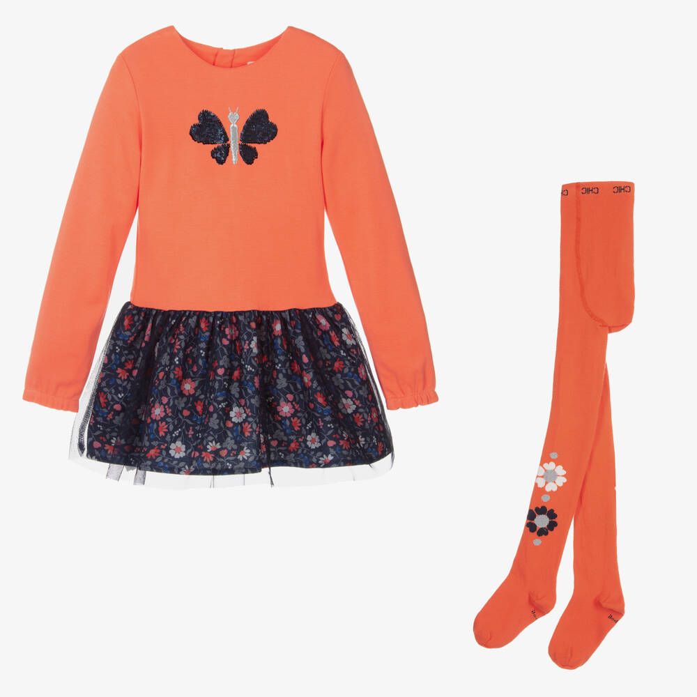 Lovely orange dress and tights set for girls by Boboli. The soft jersey dress has a fun reversible sequin butterfly on the front and a gathered navy blue floral skirt with a fine tulle overlay. The long sleeves are gently elasticated at the cuff and the dress fastens with a concealed zip on the back. To complement the dress, the stretchy, cotton-rich tights, have a floral pattern with silver thread for a sparkly finish.
