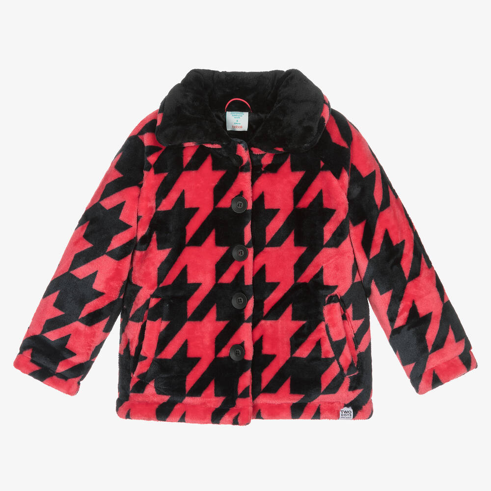 Super soft and cosy plush fleece jacket for girls by Boboli, in an oversized pink and black houndstooth pattern. It has a quilted silky lining and is lightly padded for extra warmth. Fastening with large, black buttons down the front, it is styled with a black collar, two fleece-lined hand pockets and a back flap with a fixed button.