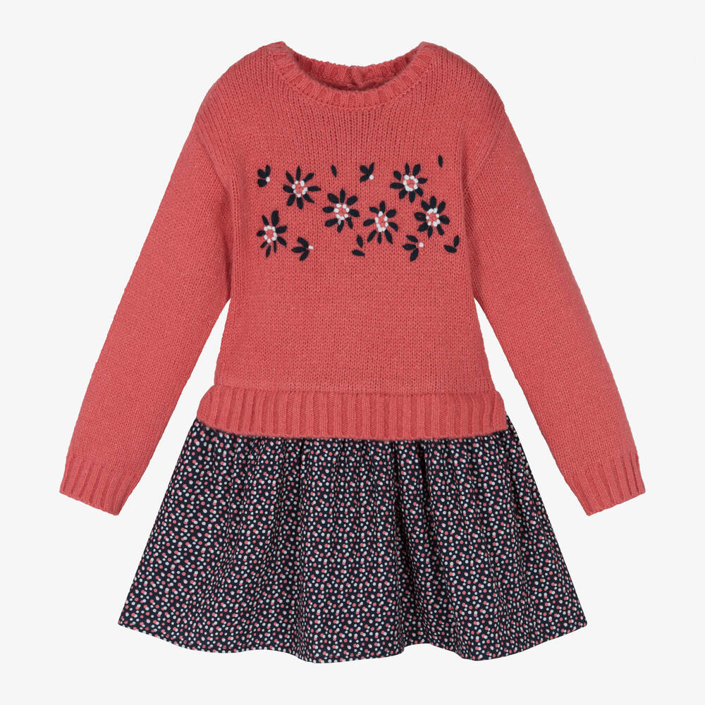 Pretty pink and navy blue dress for younger girls by Boboli. Giving the appearance of a two-piece, the softly knitted bodice has a lovely embroidered floral design across the front and cosy ribbed trims. The gathered, soft twill skirt has a pink and white dot pattern for a coordinated finish. There are button fastenings on the back and the skirt is lined in cotton for comfort.