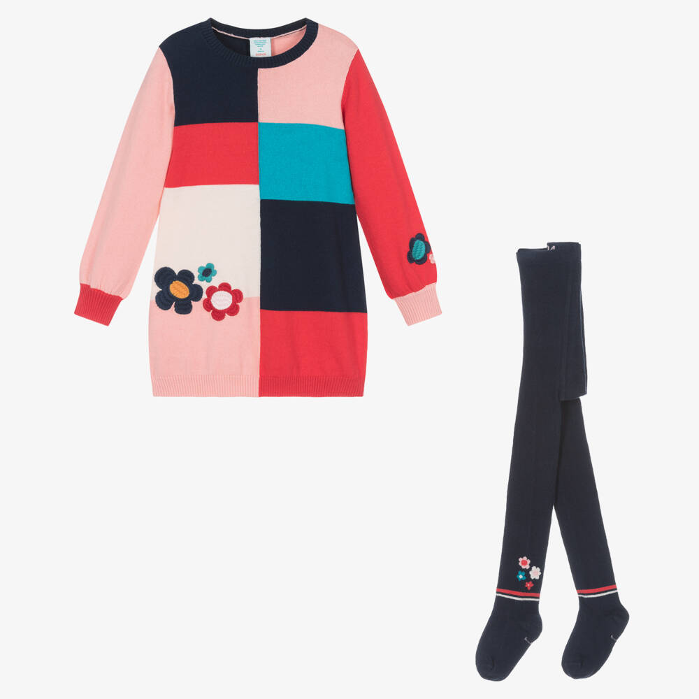 Lovely and comfortable sweater style dress and tights set for girls from Boboli, in pink, red and blue colour block. Comfortable and easy to slip on, the dress is knitted in soft cotton and viscose blend with colourful flower embroidery detailing. A pair of navy blue cotton tights with matching flower motif completes the look.