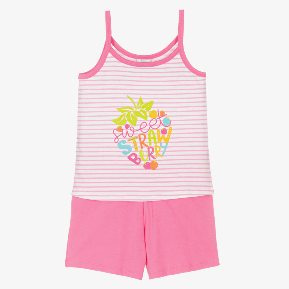 A cute pink pyjama shorts set for girls by Boboli, made in soft and stretchy organic cotton jersey. Comfortable to wear, the striped top has a fun 'sweet strawberry' slogan print on the front and narrow pink shoulder straps. The plain pink shorts have an elasticated waistband for a good, comfortable night's sleep.