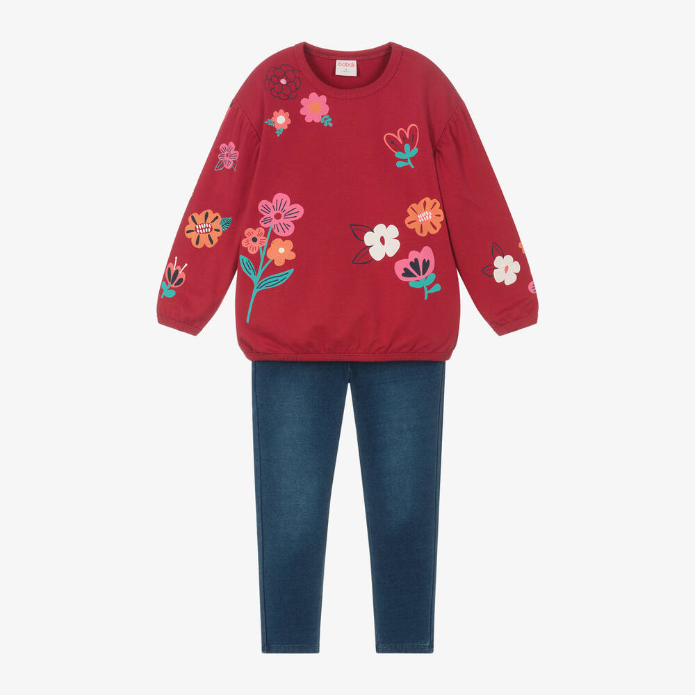 Casual red and blue jeggings set for girls by Boboli. The lovely red cotton jersey top has a colourful floral design, puffed long sleeves and a stylish relaxed fit. Smaller sizes have popper fastening on one shoulder to help with dressing. The mid-blue denim look jeggings are made in soft and stretchy cotton blend jersey for comfortable wear. Easy to pull on, they have two back pockets, belt loops and logo rivets.