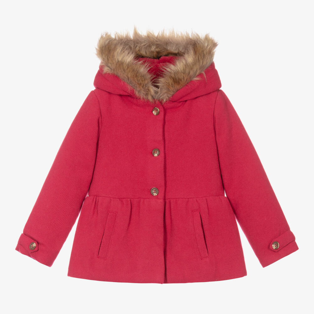 A lovely red coat for younger girls by Spanish brand Boboli. Mid-weight and warmly padded, it has front button fastenings and a pair of lined pockets. The hood is lined with beautifully soft plush fabric and trimmed with beige faux fur for a cosy feel.