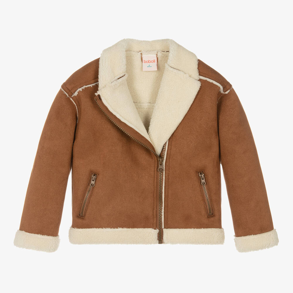 Tan brown and ivory, biker-style jacket for girls by Spanish brand Boboli, made in faux shearling. Beautifully soft, cosy and easy to wear, it has an asymmetric front zip fastening and useful zipped pockets.