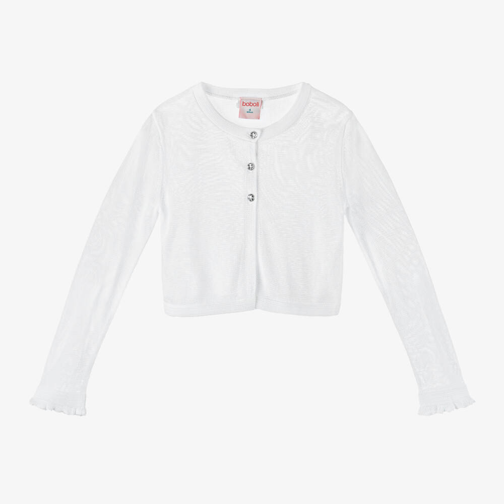 A lovely white long-sleeved cardigan for girls by Spanish brand Boboli. Comfortable and lightweight, it is finely knitted in soft viscose, with frilly trim on the cuffs. There are crystal button fastenings for a touch of sparkle.
