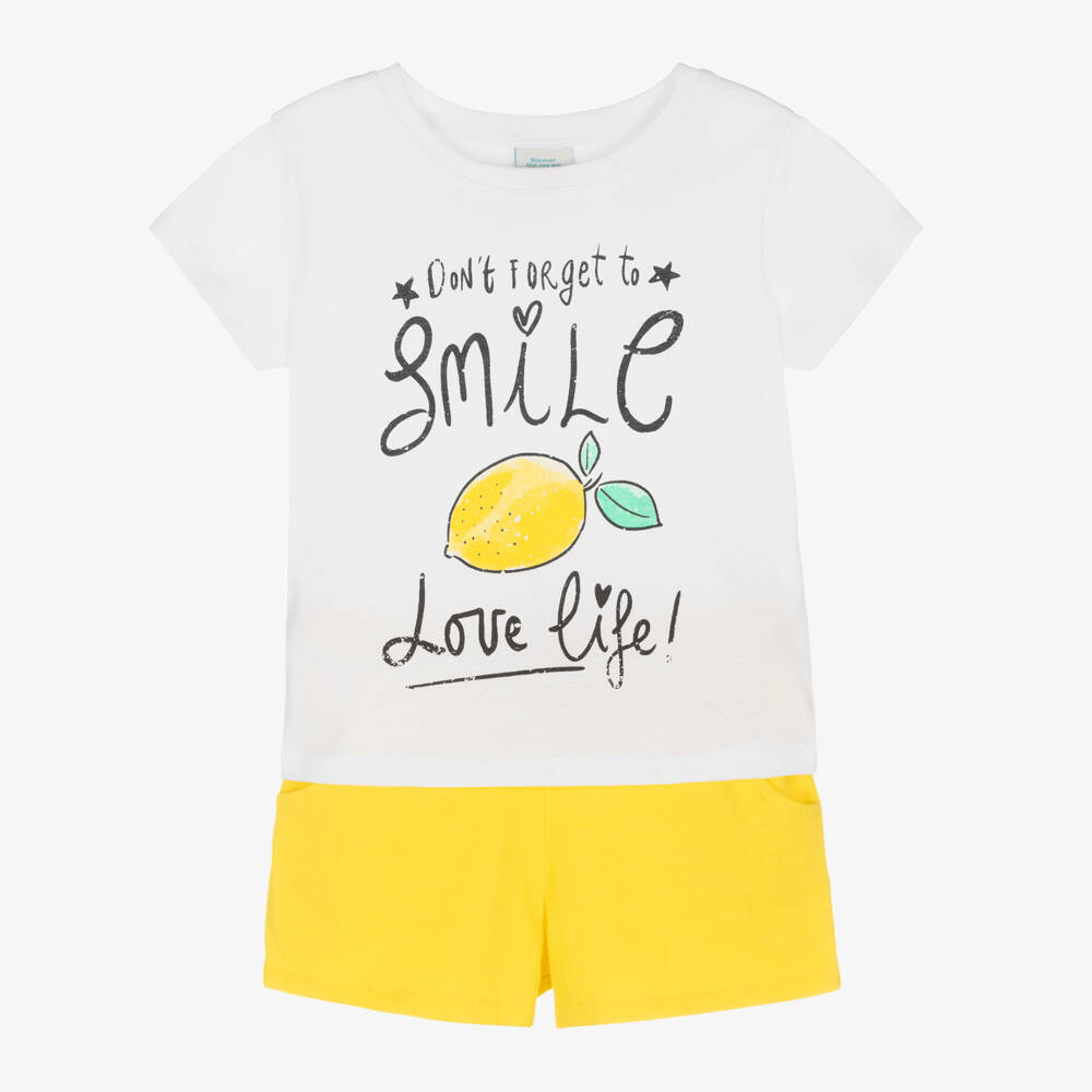Cute white and yellow cotton shorts set for girls by Boboli. The white jersey top has a cute yellow lemon slogan print on the front. It comes with bright yellow shorts that have a comfortable drawstring waist, to allow for a comfortable fit throughout the day.