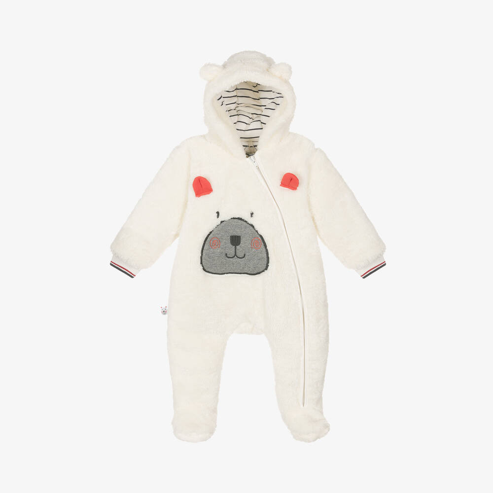 Soft and snuggly ivory pramsuit for baby boys and girls by Boboli. Made in cosy teddy fleece, it has sweet 3D bear ears on the hood, with a cute bear face and ears appliquéd on the front. Lightly padded for warmth, it has a soft cotton jersey lining and an easy front zip fastening. The ribbed cuffs have striped trim in red and navy blue and the soles of the feet have appliqué paw pads for an adorable finish.