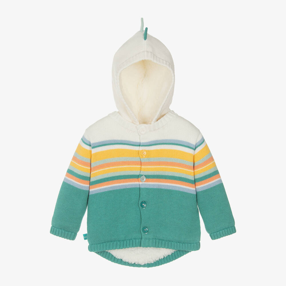 Ivory and green pram coat for baby boys and girls by Spanish brand Boboli, with orange, yellow and blue stripes. Lovely for keeping baby warm when out and about, this colourful design is knitted in a soft cotton and viscose blend, with a cosy sherpa fleece lining. Fastening with buttons on the front, it has fun 3D knitted spines down the back and on the detachable hood.