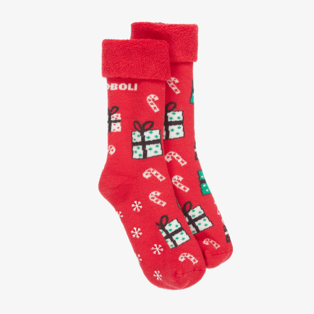 Lovely and festive, these cute red cotton socks for boys and girls are from Boboli. Soft and cosy, they are made in a cotton knit with a thick towelling on the inside and cuffs. They have a colourful present and candy cane design with white logo motifs. The rubberised snow flakes on the bottoms improve grip when worn as slipper socks indoors.