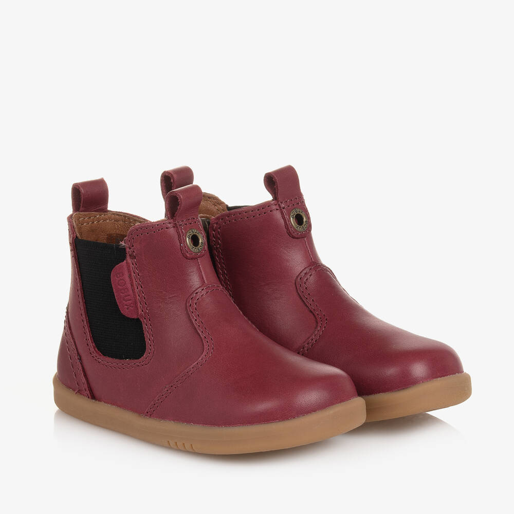 Burgundy red boots for baby girls by Bobux, in a classic Chelsea style. Made in soft leather, they fasten easily with a zip on the inside of each shoe. Podiatrist approved, these comfortable shoes have a soft leather insole and lining. The rubberised, tan brown outer sole has ridges to improve grip when your little one's taking their first steps.