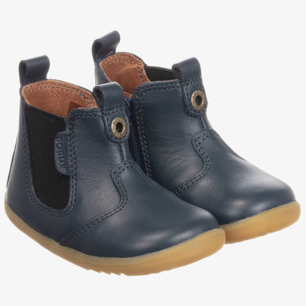 Navy blue, first walker boots for baby boys and girls by Bobux Step Up, made in super soft leather. Practical as well as comfortable, these stylish boots have elasticated side panels and side zip closure for easy putting-on and taking-off. They have breathable leather insoles, with rubber outer soles for good grip.