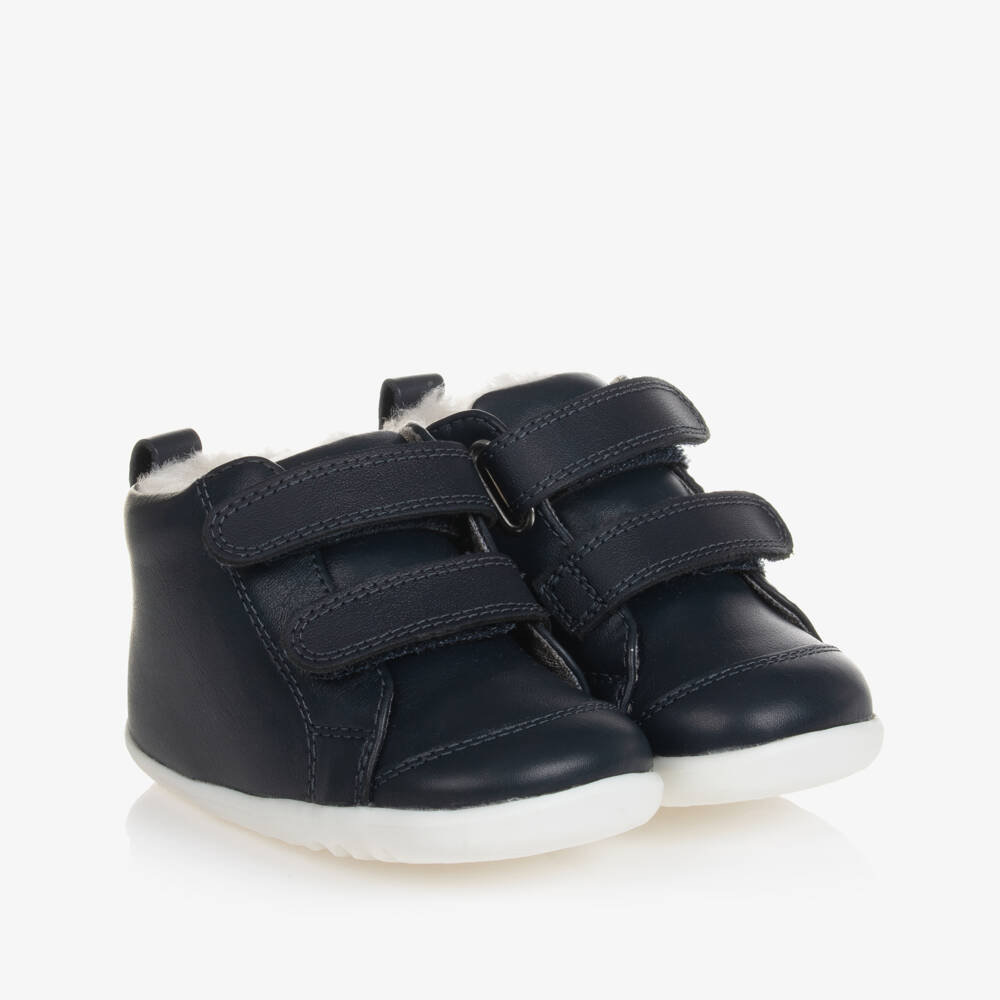 Made from smooth leather, these navy blue first walker boots for baby boys are by Bobux Step Up. Lined in soft faux fur for extra warmth, they have an internal waterproof membrane that helps keep little feet dry. There are practical velcro fastenings for easy dressing, and white flexible non-slip rubber outsoles for additional comfort when walking.