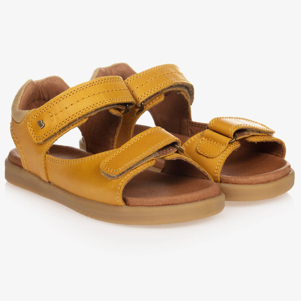For boys and girls, these mustard yellow sandals are by Bobux IWalk. Made and fully lined in soft, flexible leather, they have adjustable velcro straps over the toes and ankles. Endorsed by podiatrists, they have a flexible non-slip rubber outsole with a comfortable padded insole and heel.