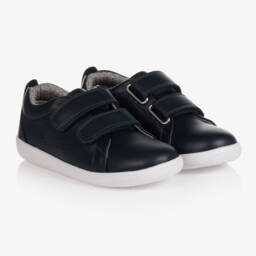 Navy blue trainers for boys and girls by Bobux Kid +, made from smooth leather. Approved by podiatrists, they are lined in breathable cotton for extra comfort and have padded ankle cuffs for additional support. Fastening with practical velcro straps, they have a white non-slip rubber outsole and branded details on the heel and the side.