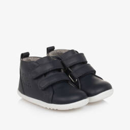 Navy blue leather first walkers for baby boys and girls from Bobux Step Up. Approved by podiatrists, this timeless, high-top style is ergonomically designed to support delicate feet as they take their first steps. Soft and supple, with a comfortable jersey lining, they feature adjustable velcro straps for easy wear. The rubber outsole has feature grooves for maximum flex and anti-slip grip.