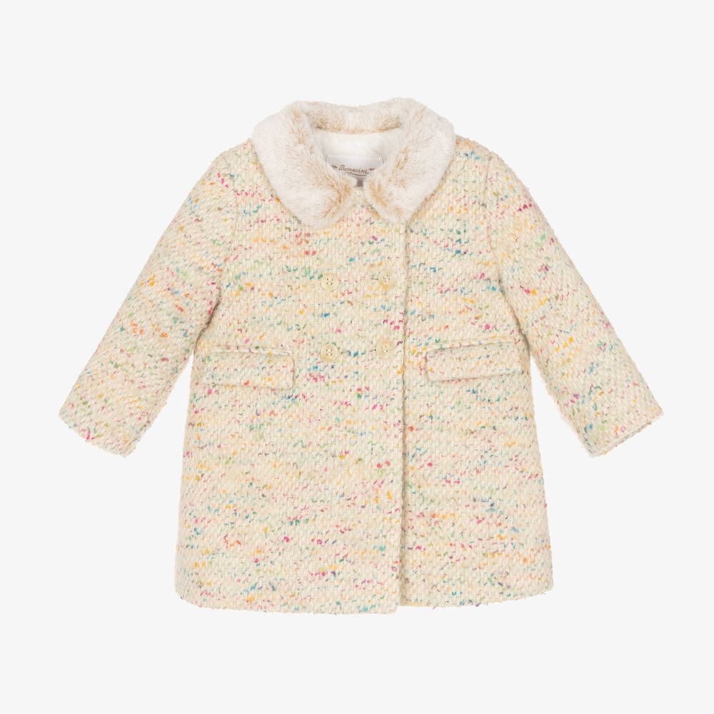 Smart ivory tweed coat for baby girls by classic French brand Bonpoint, with colourful flecks in the weave. Lightly padded, it is made in a warm wool, alpaca, and cotton blend and is beautifully soft to the touch. It has a faux fur collar and useful flap pockets, with double-breasted, branded button fastenings on the front. There is an ivory satin lining for comfort.