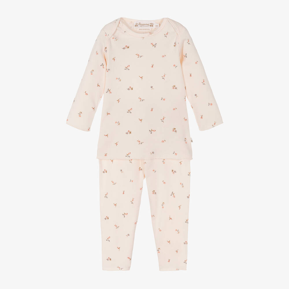 A pretty pink pair of pyjamas by luxury French brand Bonpoint, made in lightweight cotton jersey for a comfortable nights sleep. Beautifully soft with delicate overlocked edges, they have a dainty pink and blue floral design. The top has a useful envelope neckline to help with dressing and the bottoms have an elasticated waist, ideal for little tummies.