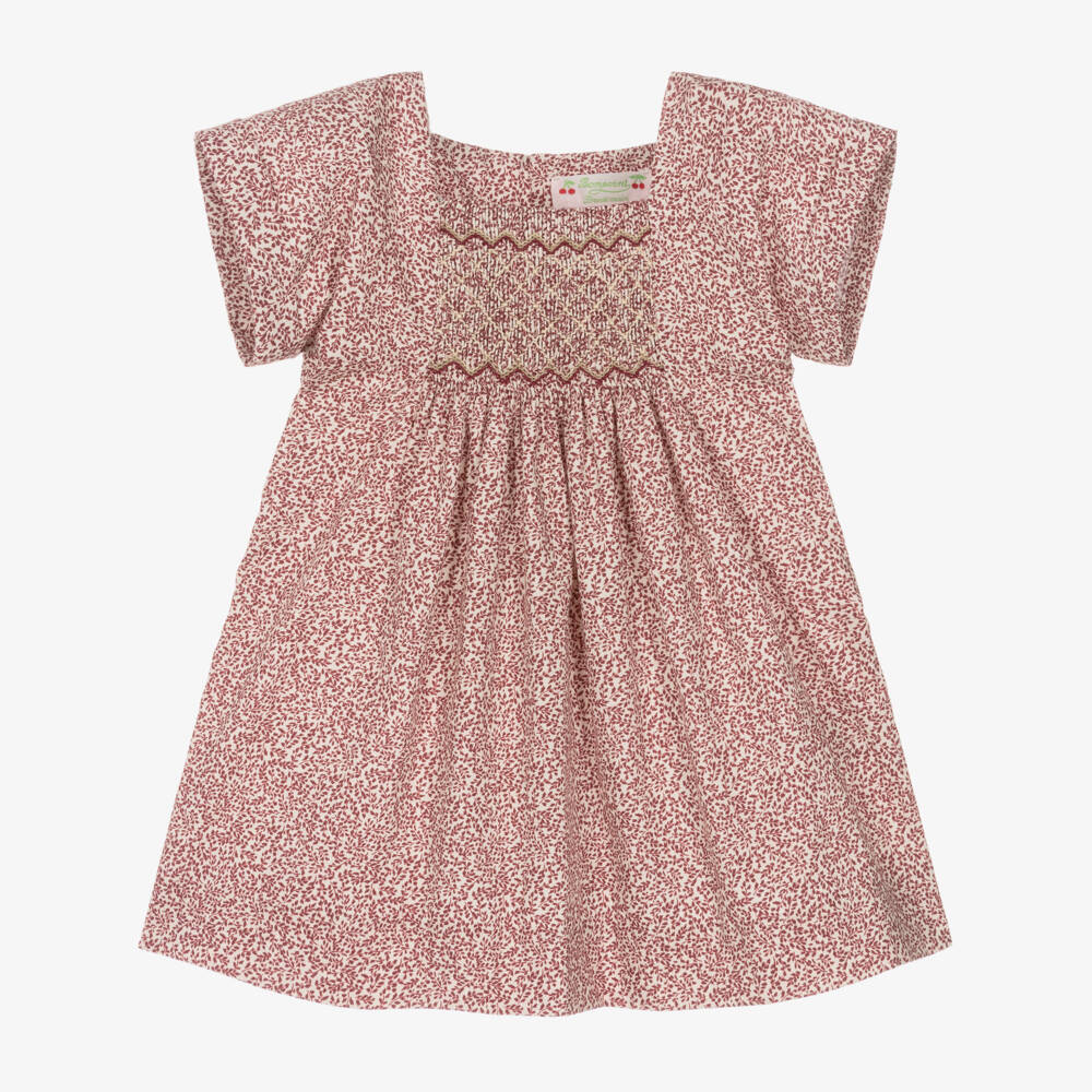 An ivory dress for baby girls by Bonpoint, made from soft and delicate cotton poplin. It has a red floral pattern with embroidery on the classically smocked bodice. The sleeves have folded cuffs, and the back has pearlescent button fastenings.