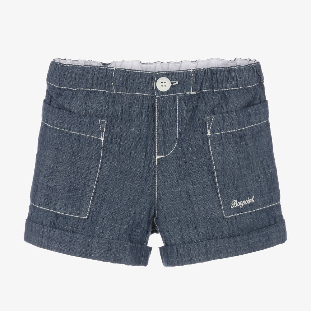Dark blue shorts for little boys by luxury French brand Bonpoint, made in comfortable and lightweight cotton chambray. Easy to pull on, these casual shorts have an elasticated waistband and a single button fastening on the front. With turn-up hems, they have white topstitching details and the designer's name embroidered on the front pocket.