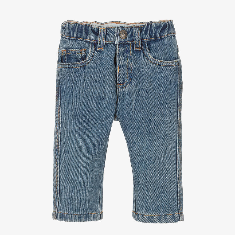 Washed mid-blue denim jeans for little boys by luxury French brand Bonpoint. Made in a soft cotton blend, the waistband is elasticated for comfort and they fasten with a branded popper. A classic five-pocket style, they have a branded faux leather jacron on the back to complete the look.