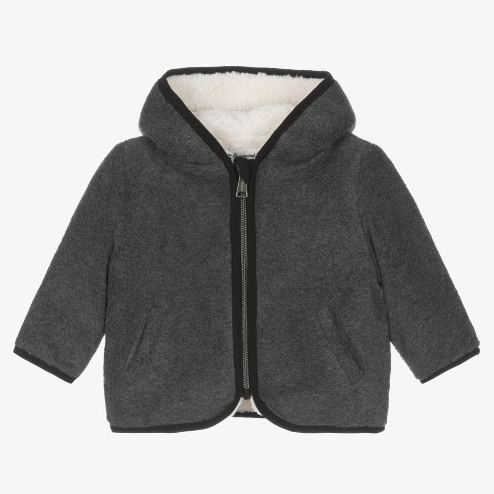 A charcoal grey zip-up top for little boys by Bonpoint, made from soft polar fleece with black trims. Ideal for the colder months, this hooded top is lined in cosy ivory sherpa fleece for extra warmth. It has slanted pockets on the front, a front zip fastening with protective chin guard, and a subtly embroidered logo on the chest.