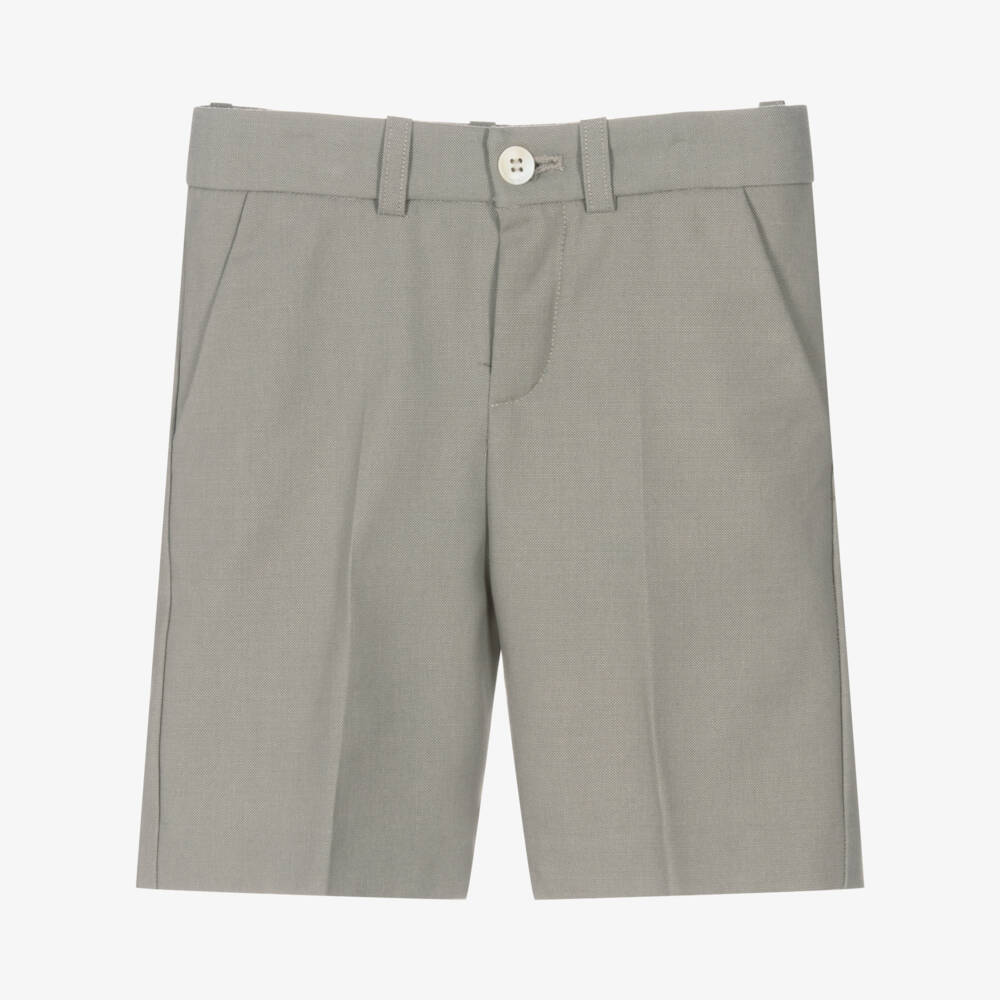 Grey Bermuda-length chino shorts for boys by luxury French brand Bonpoint. Made in a softly textured cotton and wool blend, these smartly tailored shorts have pleated fronts and slanted pockets on the hips. Other details include welt pockets on the back and useful belt loops on the waist. They fasten with a button and zip on the front and have an adjustable waistband for a better fit.