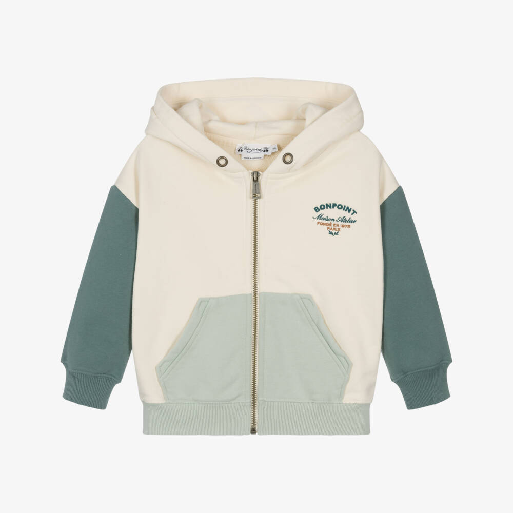 Colourblock, zip-up hoodie for boys by Bonpoint, in ivory and shades of green. Embroidered with a logo on the chest for instant designer appeal, it is made in comfortable cotton jersey and has a front pouch pocket to complete the casual look.