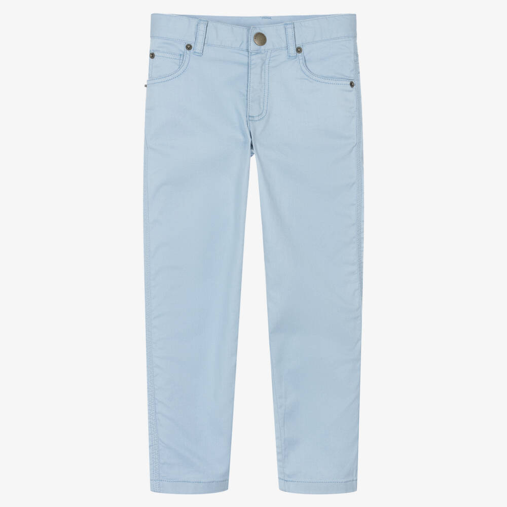 Pale blue jeans for boys by luxury French designer Bonpoint, made from a lightweight cotton twill, with a slight stretch for additional comfort. Complete with five-pocket detailing, a front zip and popper fastening, an adjustable waist, and a jacron branded patch on the back, these jeans are cool, comfortable, and easy to wear.