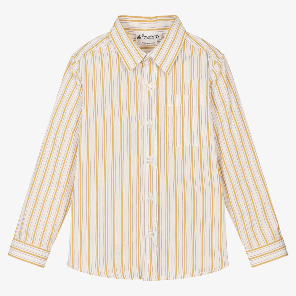White, golden yellow and burgundy red striped shirt for boys from luxury French brand Bonpoint, made in a soft and lightweight cotton weave. A great option for those smarter occasions, this signature piece has front button fastenings, a pointed collar and a neat patch pocket on the chest.