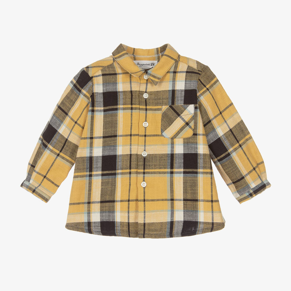 Little boys yellow flannel shirt by French brand Bonpoint, woven in soft cotton. In a check design, it has a pointed collar and glossy buttons fastening the front. Button fastening cuffs and a patch pocket add a smart touch.