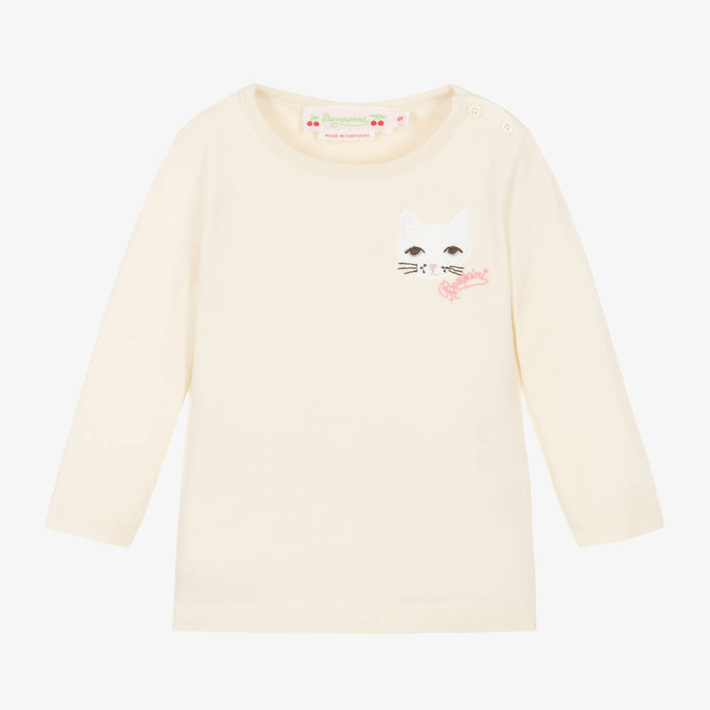A pale beige long-sleeved top for little girls by Bonpoint, made from soft cotton jersey. Simply styled, it has an adorable white cat embroidered on the chest alongside a pink logo for an added designer touch. There are button fastening on one shoulder for easy dressing.