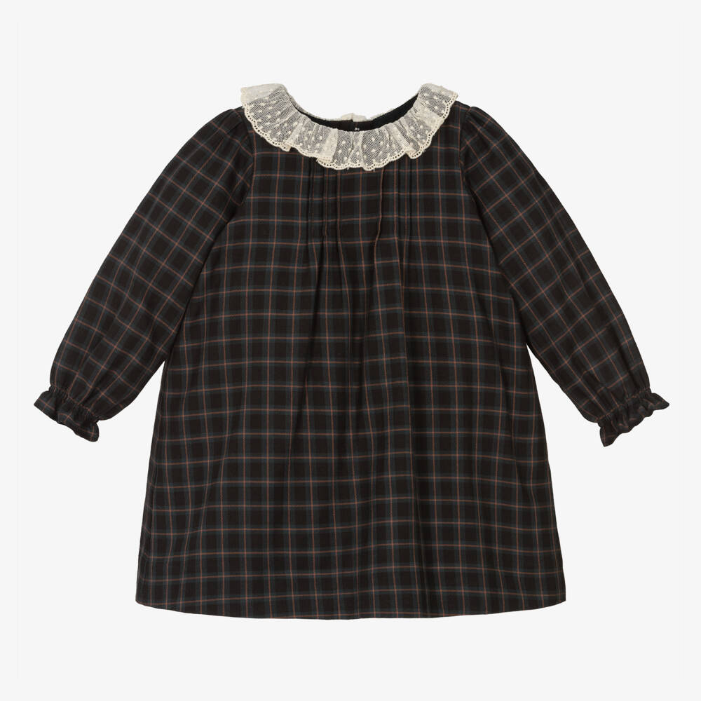 Girls Black Check Lace Collar Dress