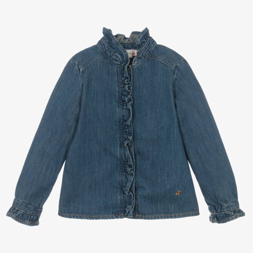 Casual yet stylish blue denim blouse for girls from luxury French brand, Bonpoint. Made with cotton, this mid-weight denim blouse is beautifully soft, with a washed and worn look. Feminine ruffle trims on the collar, front and cuffs add a classic finish and the blouse fastens with concealed buttons.