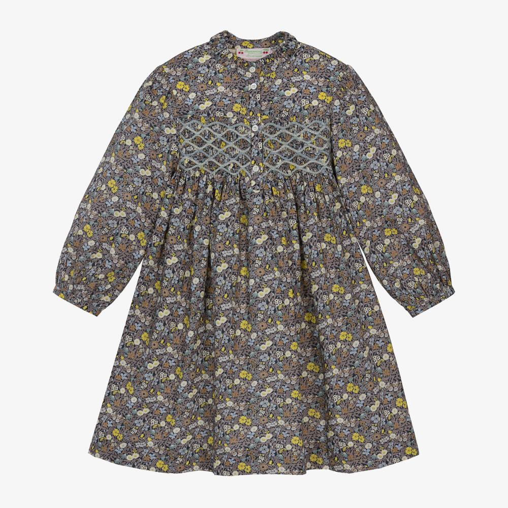 A delightful navy blue long-sleeved dress for girls by luxury brand Bonpoint. Printed with a beautiful blue and yellow-green floral Liberty pattern, it has a gorgeous hand-smocked panel across the chest with pale blue and sparkly silver wave-like hand embroidery. Made from smooth Tana Lawn cotton with a lightweight cotton lining, it fastens with pearlescent buttons on the front and has a high frilled neckline for a sweet finish.
