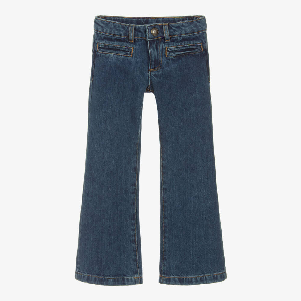 Blue jeans for girls by luxury French designer Bonpoint cut for a contemporary flared fit. Made in soft and durable cotton denim, they are styled with welt front pockets for a sleek shape and have patch pockets on the back. They fasten with a zip and hook and have an adjustable waist and belt loops for a comfortable fit. There are subtle branded details on the front and back, including the designer's signature cherry logo.