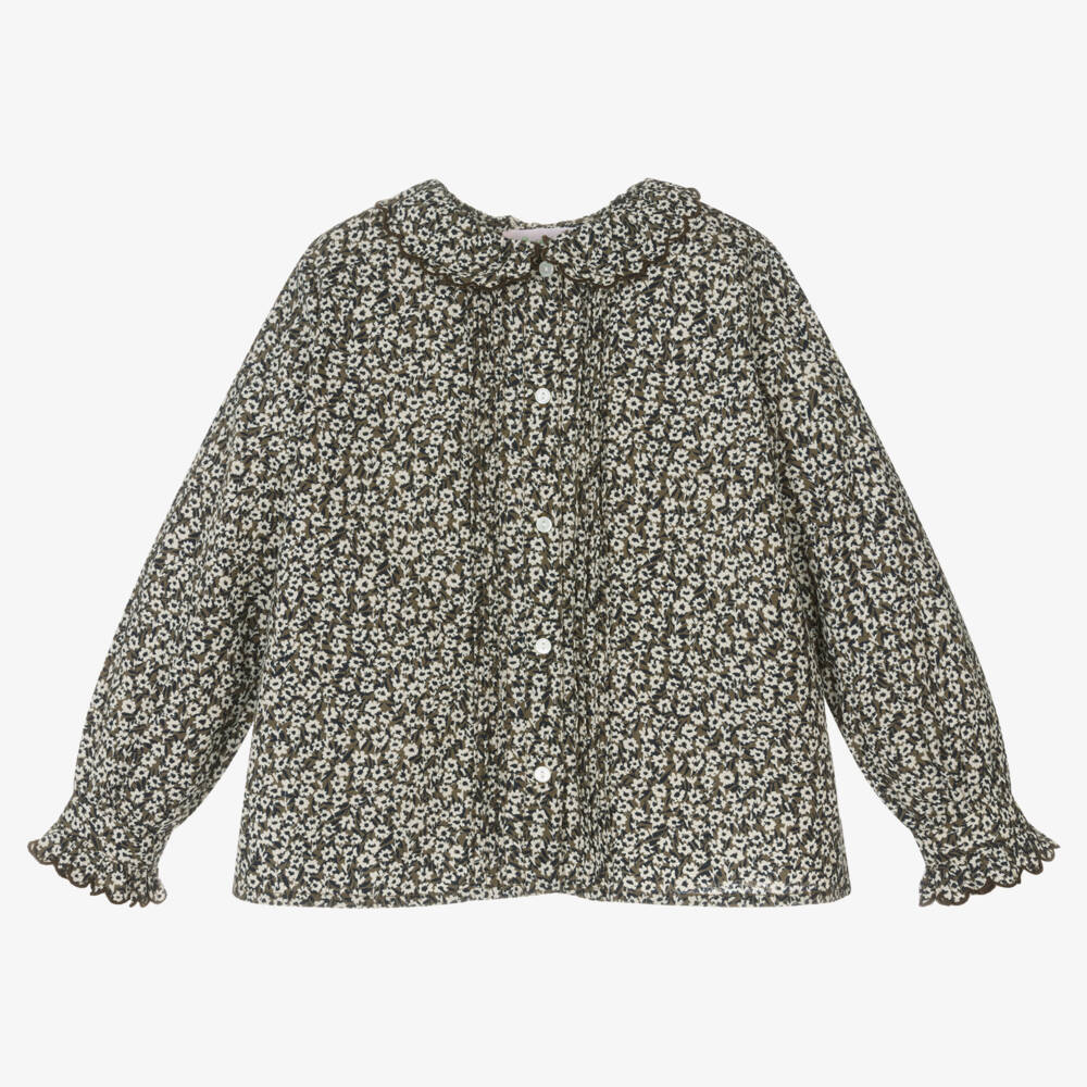 Vintage brown floral blouse for girls by luxury French designer Bonpoint, woven in lightweight cotton. Traditional and timeless, this long-sleeved blouse has a sweet, scalloped peter pan collar, with scalloped buttoned cuffs to match. It fastens in the front with pearlescent buttons, alongside a delightful pintuck detail that completes the classic look.