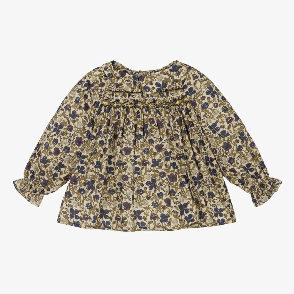 Gorgeous green Liberty print blouse for little girls by Bonpoint, made from luxurious, organic Tana Lawn cotton. Patterned in a lovely floral design, this blouse has a sweet, pointed collar and smocking on the chest for a traditional look. There are elasticated frill cuffs and back button fastenings for a classic finish.