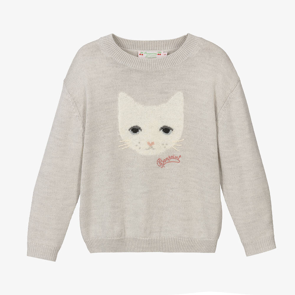 Gorgeous grey jumper for girls from French brand Bonpoint, knitted in luxuriously soft Merino wool. Lightweight yet cosy, this casual crew neck style is patterned with a white cat and embroidered pink logo on the front. In a relaxed fit with dropped shoulders, it has gently ribbed trims.