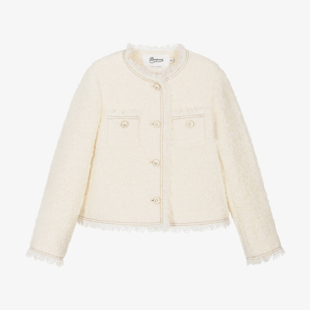 Ivory jacket for girls by luxury French brand Bonpoint, made in a soft blend of wool and viscose. Lovely for those smarter occasions, this elegant bouclé tweed jacket is styled with chest patch pockets, a rounded neckline and fringed edges. It has a sparkling gold trim that coordinates beautifully with the ivory and gold crest buttons and to ensure comfort, it is lined in soft cotton.