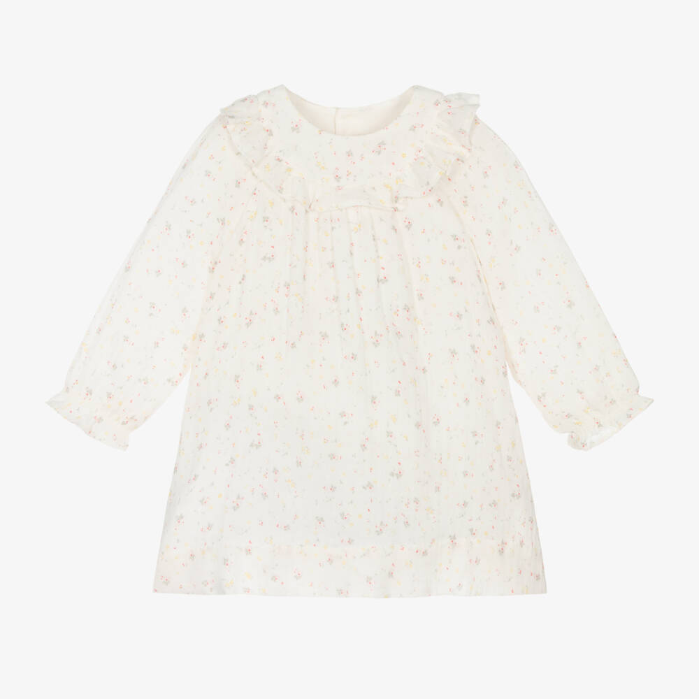 A beautiful ivory dress for little girls by Bonpoint, made from lightweight cotton voile. Fully lined, this dress is printed with a charming red and yellow ditsy floral pattern for a subtle touch of colour. It has a sweet frilled collar and button fastenings on the back for a classic finish.