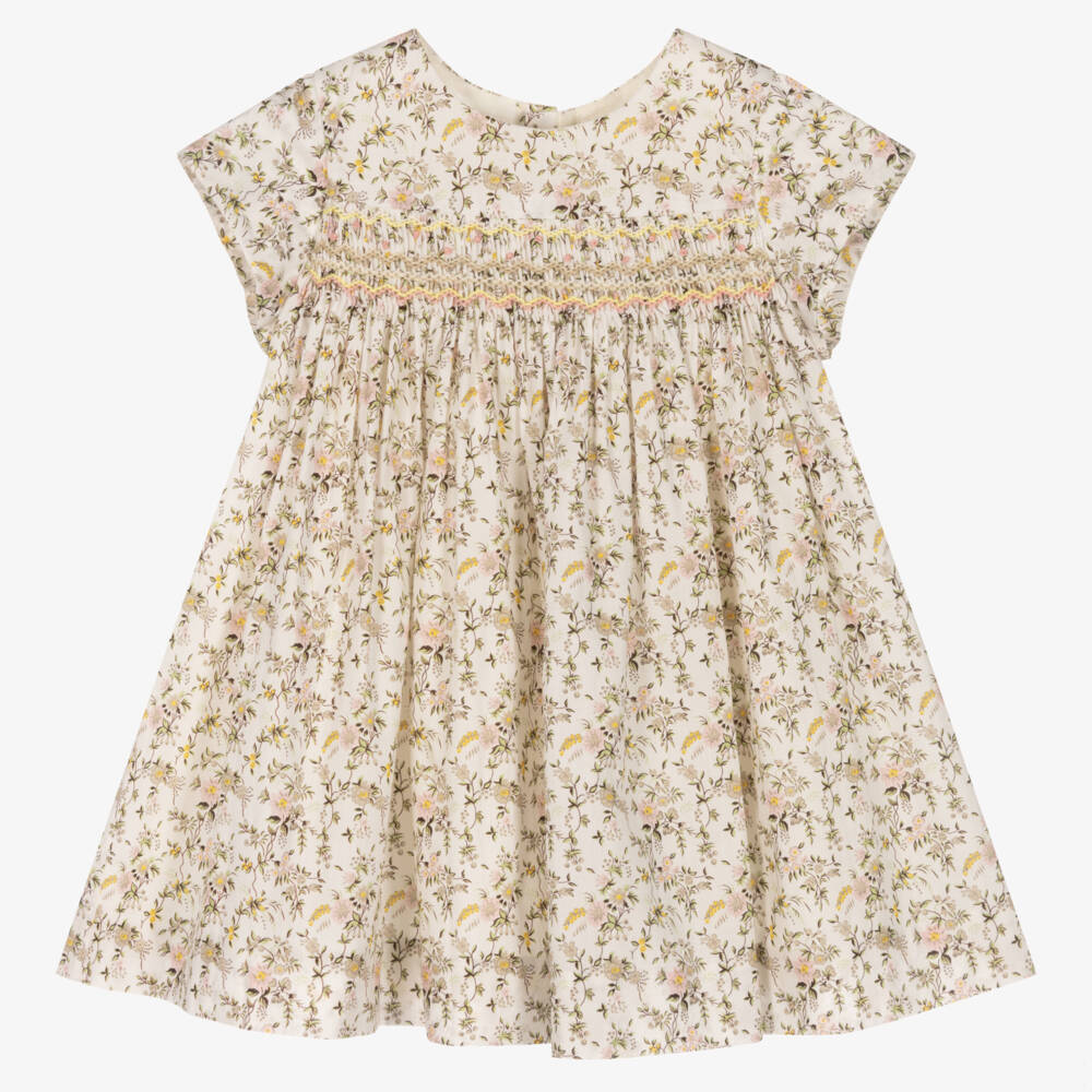 Girls ivory and green Liberty floral print dress by luxury French brand, Bonpoint. It is made in soft Tana Lawn™ organic cotton with beautiful hand-smocked detail on the front in pink and yellow to match the delicate colours of the flowers. There are dainty mother-of-pearl button fastenings on the back and it is fully lined for comfort. A pair of matching bloomer knickers are included.