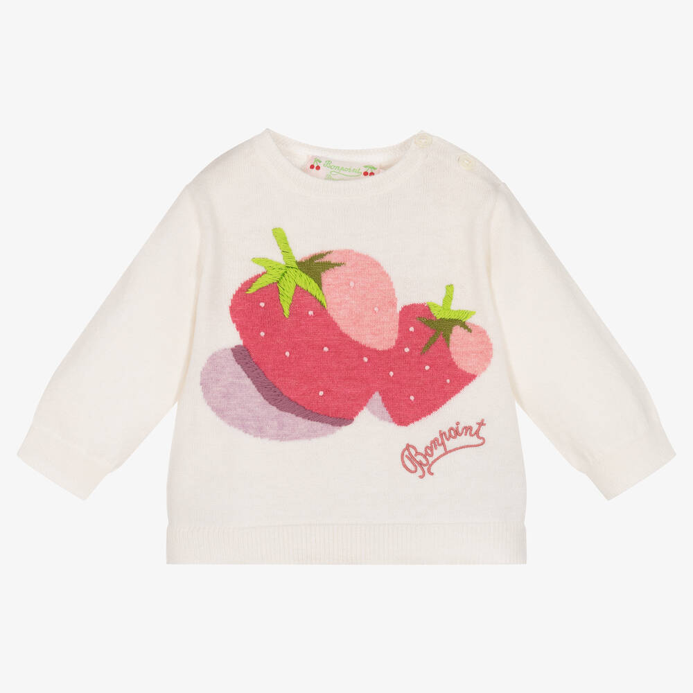 Little girls ivory sweater by luxury French brand, Bonpoint. Finely knitted in a super soft blend of wool and cotton, this lovely jumper has a strawberry intarsia design, with the brand's logo embroidered underneath. There are cute buttons on one shoulder to help with dressing and changing.
