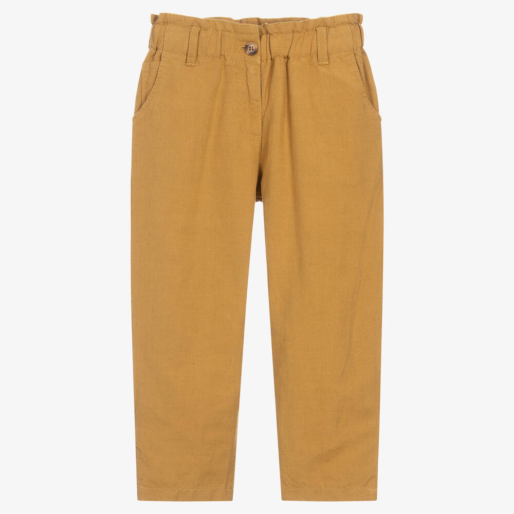 Casual ochre yellow trousers for girls by French designer Bonpoint, made in a luxurious cotton and linen blend twill. Timelessly elegant, they have a paper bag waistband which is lightly elasticated for comfort and fastens with a zip and button on the front. The brand's cherry logo is embroidered in tonal thread on one of the back pockets for a discreet designer touch.