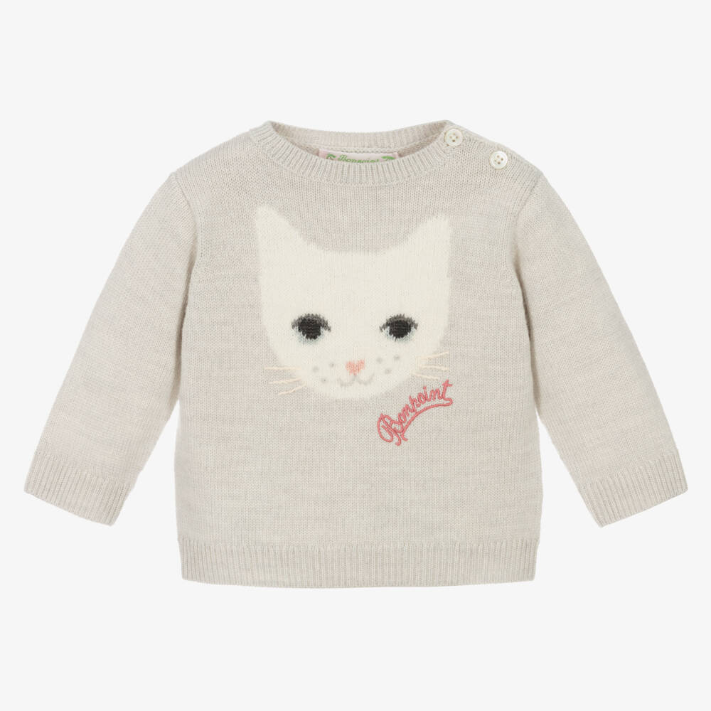Girls Pale Grey Merino Wool Cat Sweater