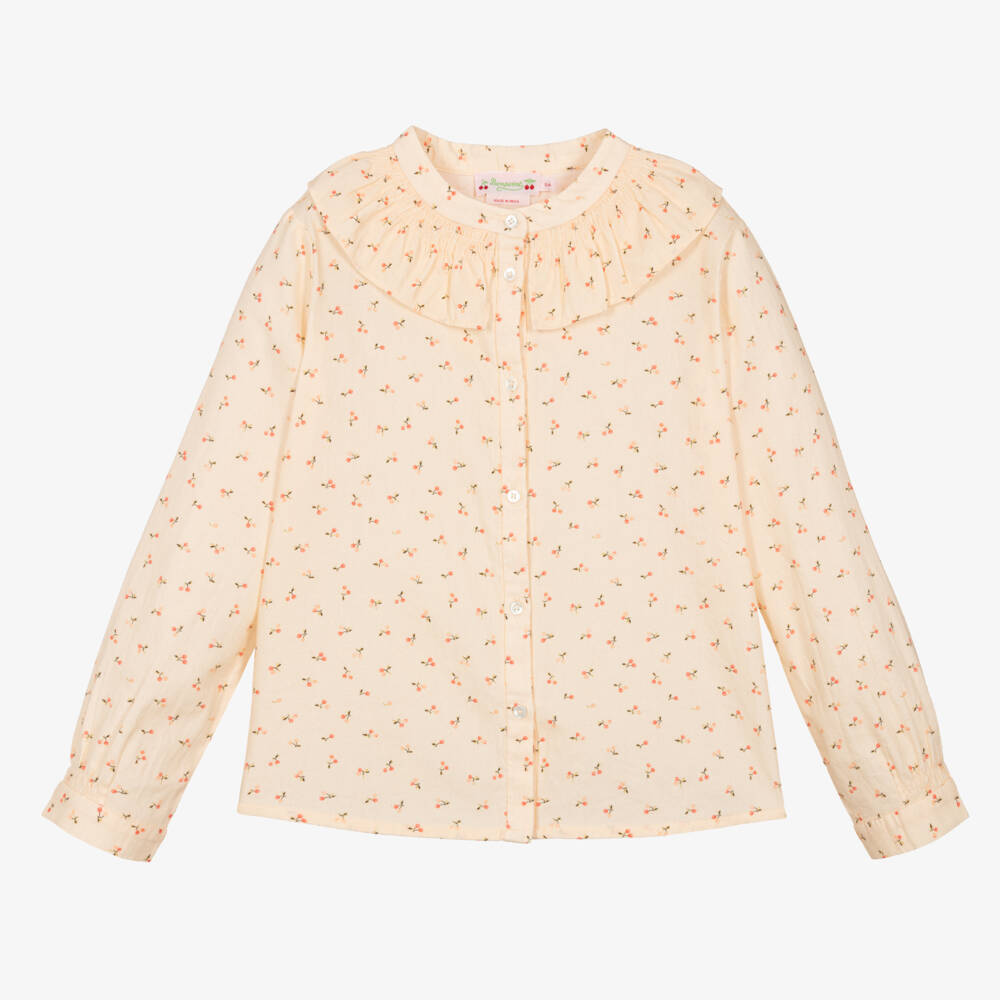 A pretty, pale coral pink blouse for girls by luxury label Bonpoint, made from softly brushed cotton. This charming, long-sleeved top is patterned with the brand's iconic cherries, for a signature look. It has a rounded neckline, with a delicately smocked ruffle adding a traditional finish. The blouse fastens neatly on the front and cuffs with pearlescent buttons.